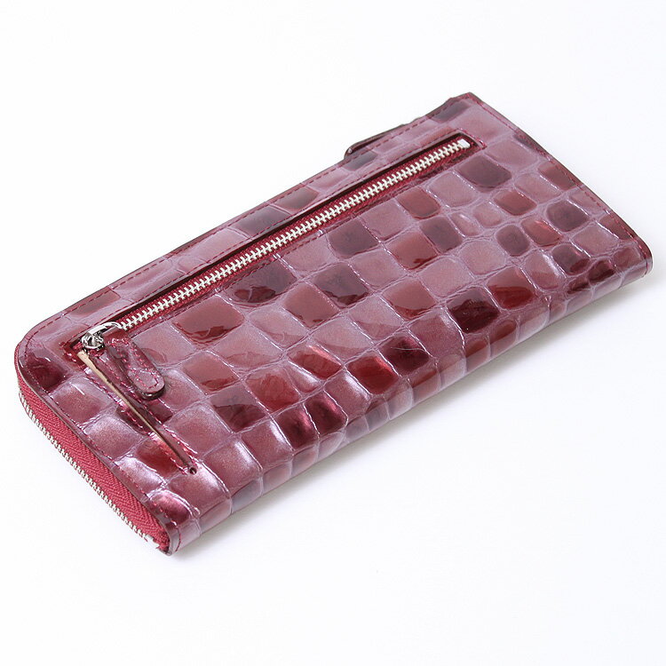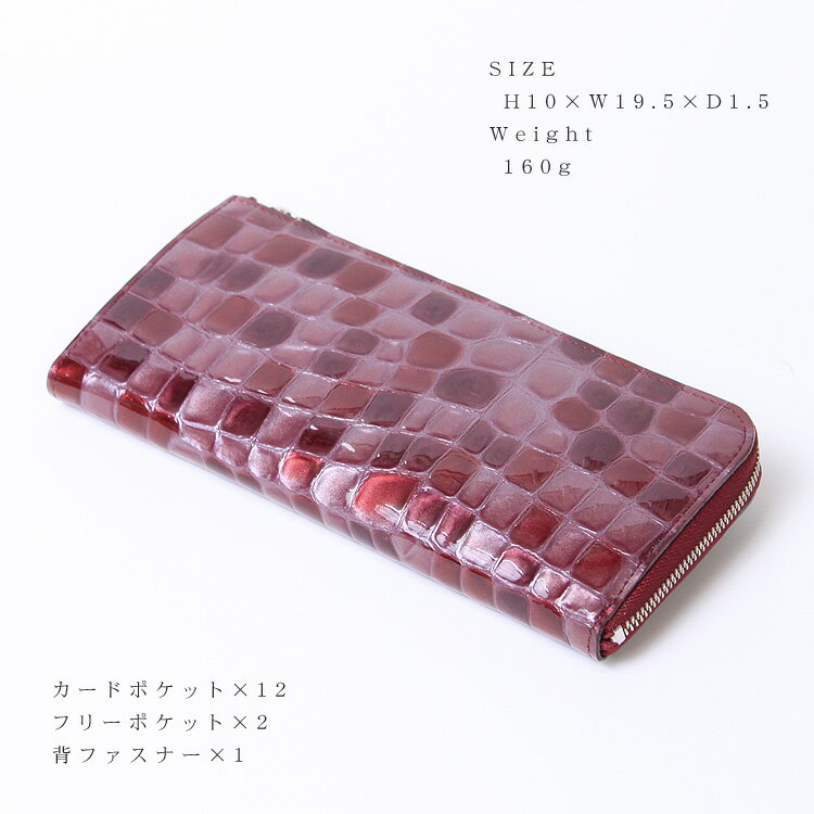 サイズ(最大部を計測) 縦幅約10cm 横幅約19.5cm マチ幅約1.5cm 商品詳細 素材牛革型押しエナメル×牛革 内側収納カードポケット×12、フリーポケット×2 外側収納背ファスナー付ポケット×1 開閉ファスナー 重さ約160g 生産国日本 備考※商品写真は実物のカラーにより近づけるために加工してありますが、お客様のご覧になる機種・設定により実際の商品と画像の色が異なって見える事があります。