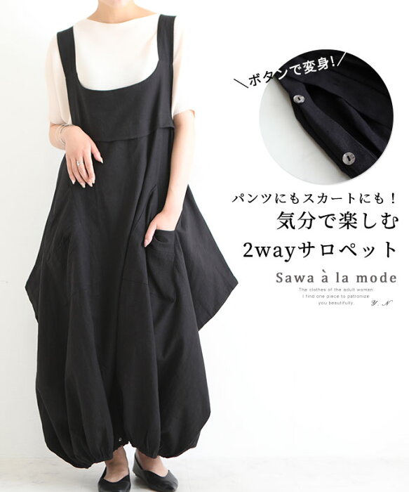 パンツにもスカートにも!着こなし広がる2wayサロペット ジャンパースカート スカート パンツ 綿 麻 ブラック レディースファッション L サワアラモード アラモード sawaalamode 可愛い服 otona kawaii かわいい服 かわいい 可愛い mori 森ガール